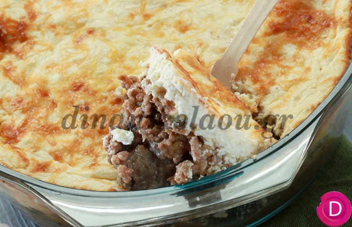 Απλώνω τον κιμά στην κρέμα μελιτζάνας, μέσα στο ταψί, ισιώνοντας καλά. Από πάνω σκεπάζω με την κρέμα γιαουρτιού.