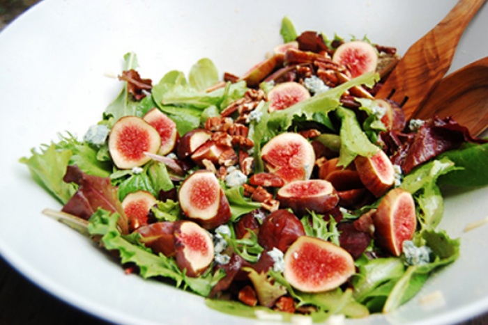 Ξεπλένουμε τη ρόκα και τα σύκα. Μπορούμε να τα ξεφλουδίσουμε ή και όχι αν δεν θέλουμε. Ετοιμάζουμε τη σαλάτα και τη στήνουμε σε μια πιατέλα. Σε ένα μπολάκι ανακατεύουμε το ελαιόλαδο, το λεμόνι και το αλάτι και περιχύνουμε τη σαλάτα. Προσθέτουμε τα καρύδια και το blue cheese και ανακατεύουμε καλά.