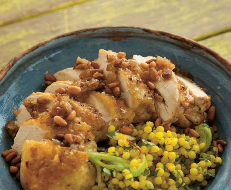 - Βγάλτε το κοτόπουλο από τον φούρνο, και κόψτε το φέτες. Σερβίρετε σε πιατέλα με τα καραμελωμένα κρεμμύδια. Ρίξτε από πάνω τα υγρά από το ταψί και συνοδέψτε το με το κουσκούς.