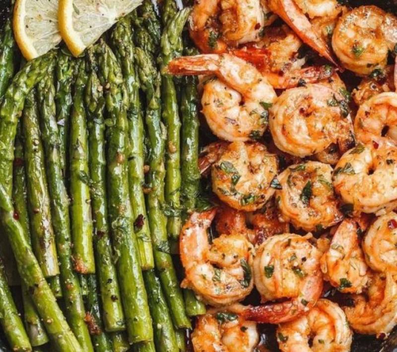 Αξιοποιήστε δύο από τα καλύτερα υλικά αυτής της εποχής: γαρίδες και πράσινα σπαράγγια.