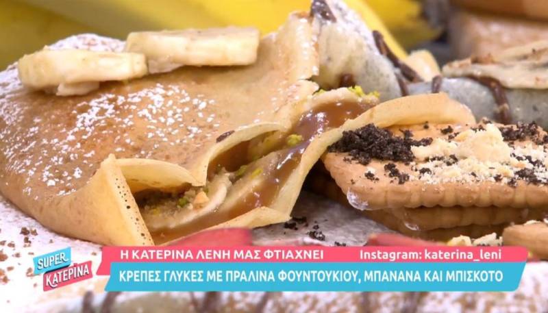 Η Κατερίνα Λένη ετοίμασε στην εκπομπή "Super Κατερίνα" λαχταριστές κρέπες, με πραλίνα φουντουκιού, μπανάνα και μπισκότο.