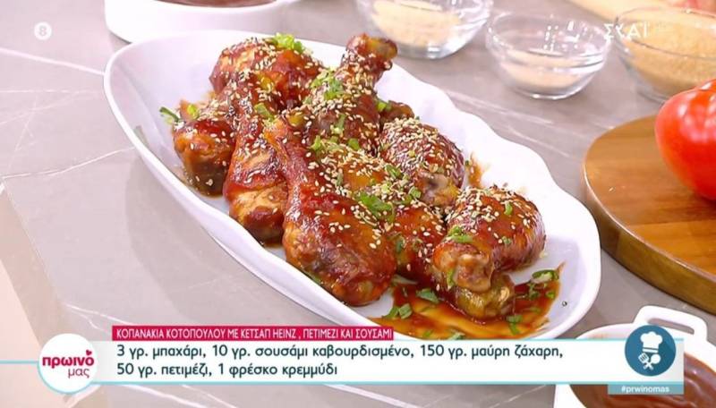 Κοπανάκια κοτόπουλου με κέτσαπ, πετιμέζι και σουσάμι από το Δημήτρη Σκαρμούτσο.