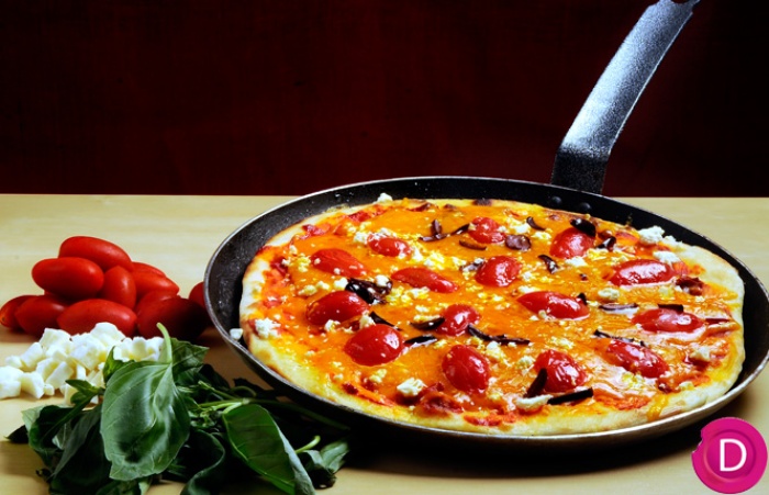 Εναλλακτικά, μόλις τηγανίσω τη σκέτη ζύμη, τη βγάζω από το τηγάνι, απλώνω επάνω της τα υλικά της γέμισης και μεταφέρω την πίτσα σε προθρμασμέο γκριλ όπου την ψήνω για 6 - 7 λεπτά, μέχρι να ροδίσουν.