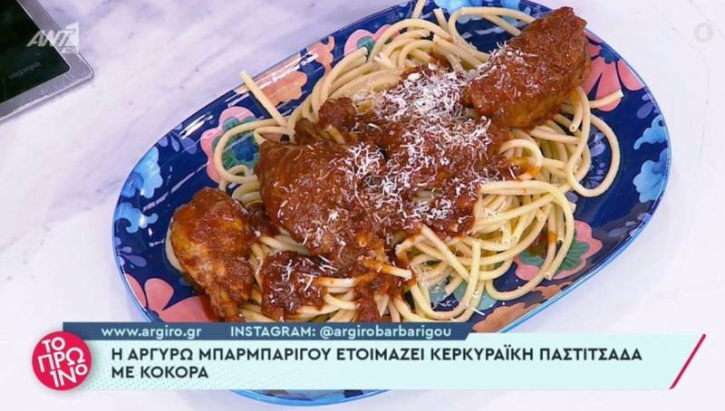 Η Αργυρώ Μπαρμπαρίγου ετοιμάζει κερκυραϊκή πατσιτσάδα με κόκορα.
