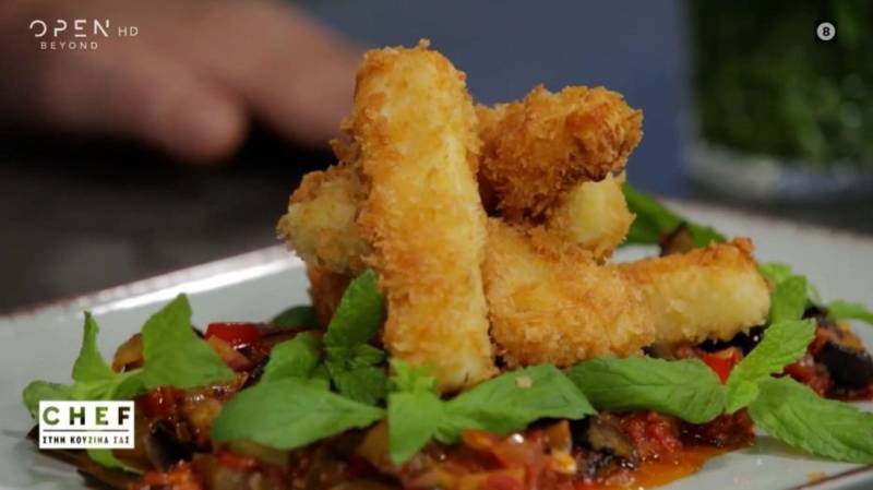 Ο Βαγγέλης Δρίσκας φτιάχνει τηγανιτό χαλούμι με πικάντικη σάλτσα λαχανικών.