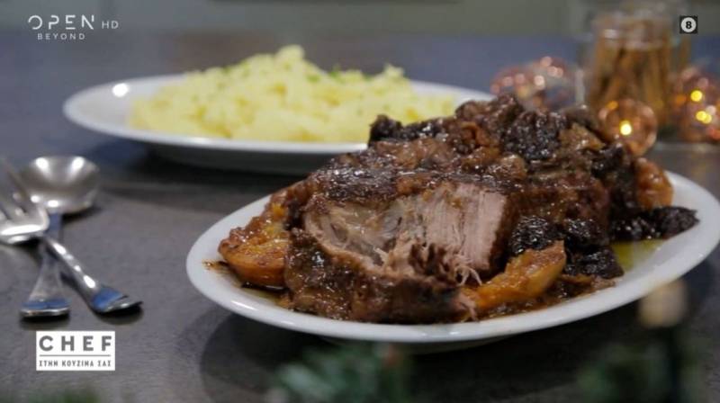 Συνταγή για χοιρινό στη γάστρα με δαμάσκηνα από τον Βαγγέλη Δρίσκα.