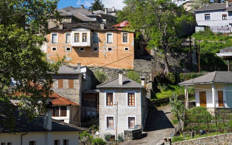 Σπίτια χτισμένα από πέτρα, καλντερίμια λιθόστρωτα, από πάνω ο Γράμμος, από κάτω η κοιλάδα του Σαραντάπορου.