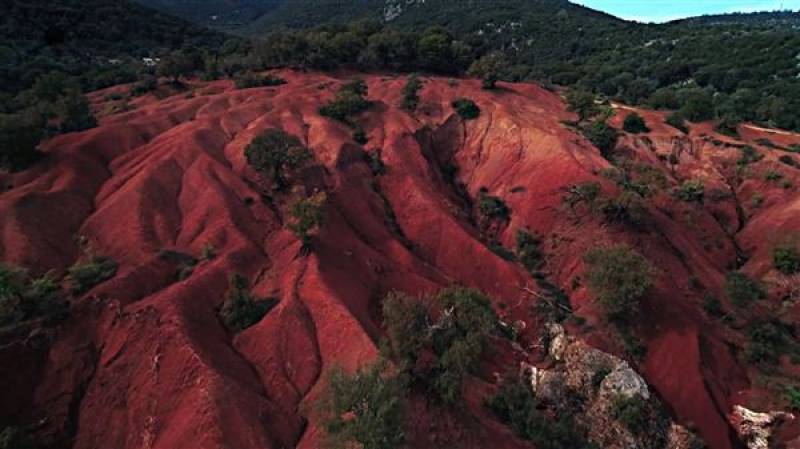 Το βρόχινο νερό μετακινεί το απαλό αυτό ερυθρό γεωλογικό υλικό προς την πεδιάδα της Στεφάνης όπου ακόμα και τα χωράφια όταν οργώνονται φαίνονται κατακόκκινα.