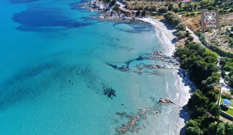 Και όχι μόνον αυτό, αλλά αποτελεί μια τεράστια τιρκουάζ «πισίνα» με πεντακάθαρα και ρηχά νερά, που είναι ιδανικά για οικογένειες. Πετάμε πάνω από την παραλία Λιανή Άμμο, κοντά στους Αγίους Αποστόλους στην Εύβοια.