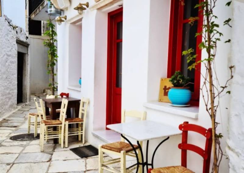 Καλντερίμια χαρακτηριστικής κυκλαδίτικης αρχιτεκτονικής με θολωτές καμάρες, όμορφα παλιά διώροφα σπίτια και πλατείες με παραδοσιακά καφενεία, εντυπωσιακοί ενετικοί πύργοι και ενδιαφέροντα μουσεία συνθέτουν την εικόνα του χωριού.