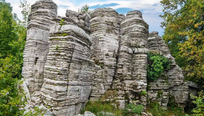 Περπατώντας στα μονοπάτια βλέπεις τεράστιες πλάκες από πέτρα, τη μια πάνω στην άλλη και δίπλα ακριβώς δέντρα. Αυτό το δάσος από πέτρινους πύργους, που έχει προκύψει από τη διάβρωση των ασβεστολιθικών πλακών με το πέρασμα των χρόνων, βρίσκεται στην ουσία μέσα σε ένα κανονικό δάσος αποτελούμενο από δρύες και σφένδαμους, αναφέρει το travelgo.